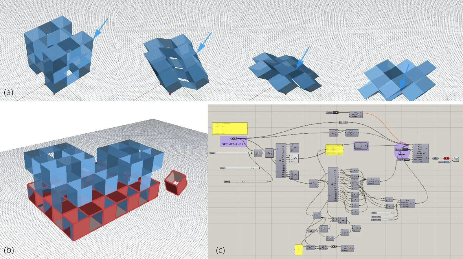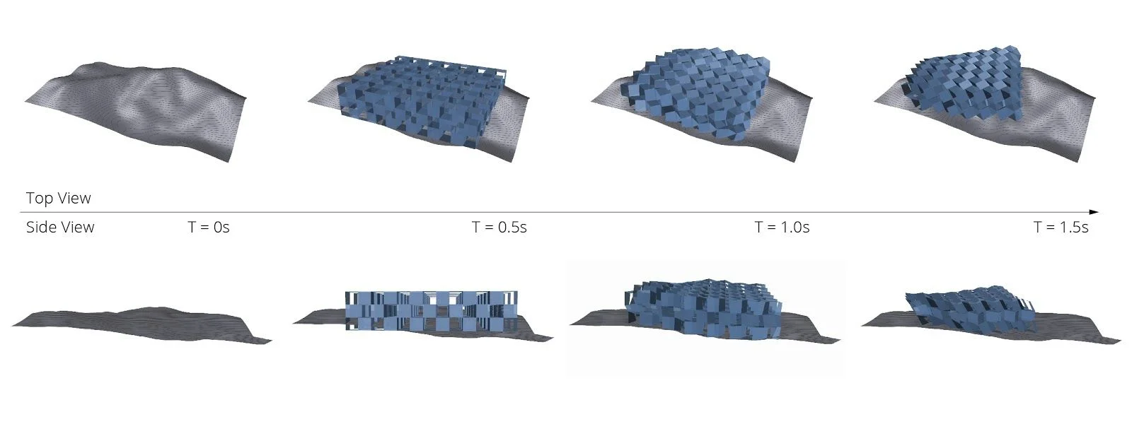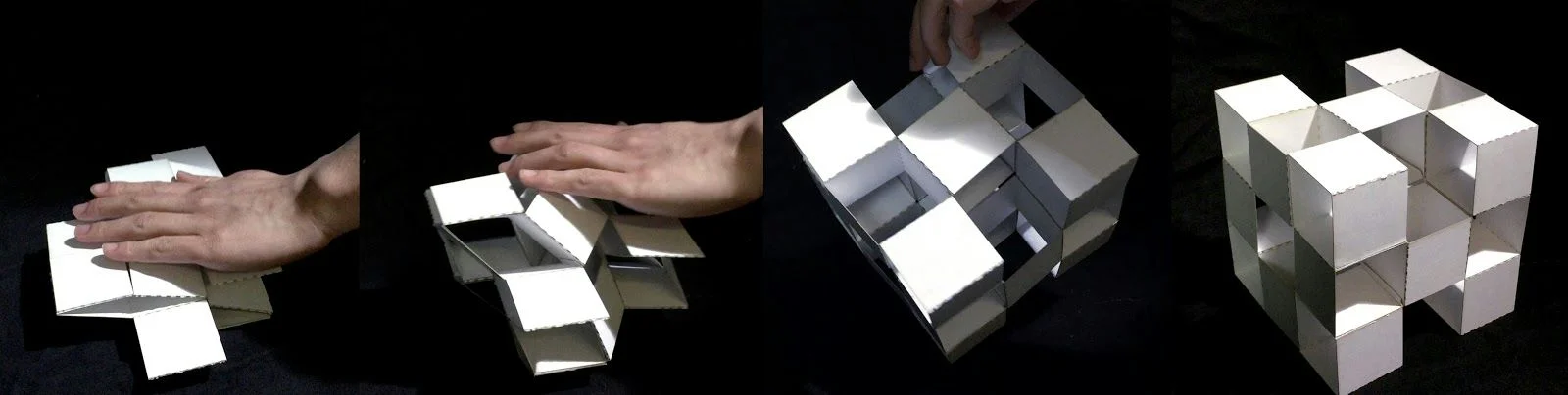 transportation. The transformation between flat and volumetric form can be automatic once it is deployed on site (without electric motors). The idea is that this structure can