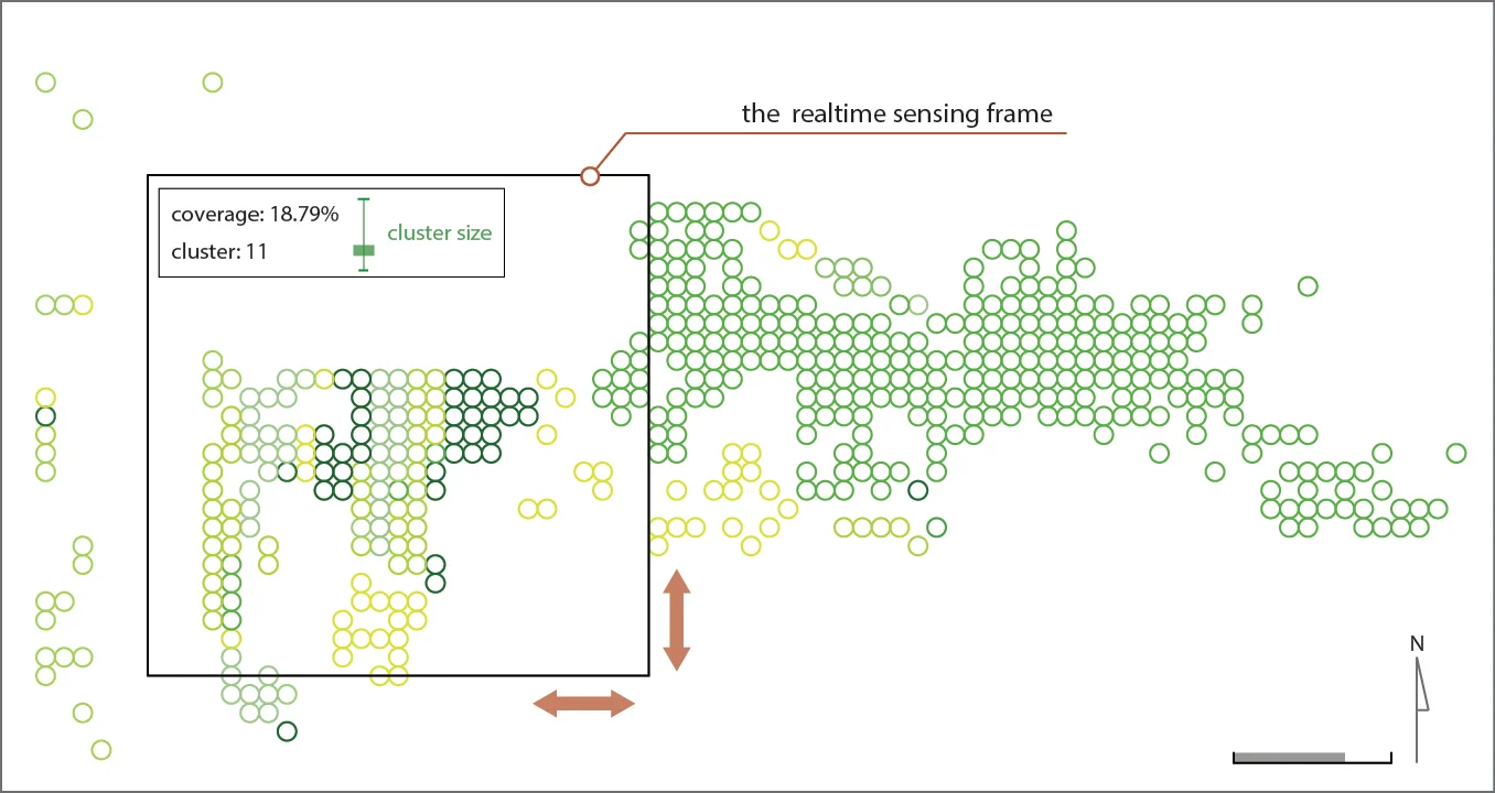 The green data now only contain the positions and colors. For further exploration of the green data in the area, we need to cluster and simplify them by their coordinates. I have tried different unsupervised learning algorithms to cluster the data, but they didn't work well. Therefore, I wrote a rule-based algorithm to identify the connection between pixels and successfully clustered the green areas.